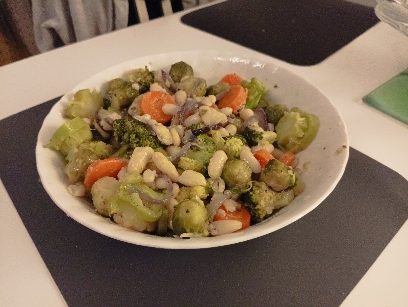 Gőzpárolóban vagy egy fém szűrőtában 10 percig párolom a zöldségeket ezután hűlni hagyom egy kicsit és hozzáadom a főtt babot. Beleteszem a fokhagymát, csípős paprikát, sót, borsot, és kb. 1 dl olíva olajat öntök rá. Az egészet összekeverem és kész.