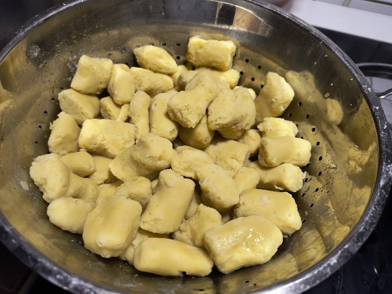 Kockákra vágom a krumplit és sós vízben megfőzöm. Amikor megfőtt, leöntöm a vizet róla és összetöröm krumplinyomóval. Annyi csicseriborsó lisztet teszek hozzá hogy gyúrható legyen, de még puha, és újnyi vastag rudakat formázok belőle és 2-3 centis darabokra vágom. Forrásban lévő vízbe rakom két-három percre és kész.