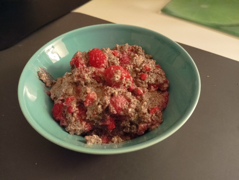 Elkészítés. Kettő deciliter kókusztejben összeturmixolok egy banánt. A banános tejturmixot kiöntöm egy tálba, bele rakom a chia magot, a mákot, az egészet jól összekeverem és steviával édesítem. Belerakom a málnát és az egészet egy pár órára berakom a hűtőbe amíg pudingszerűre összeáll, és kész. Jó étvágyat kívánok hozzá.