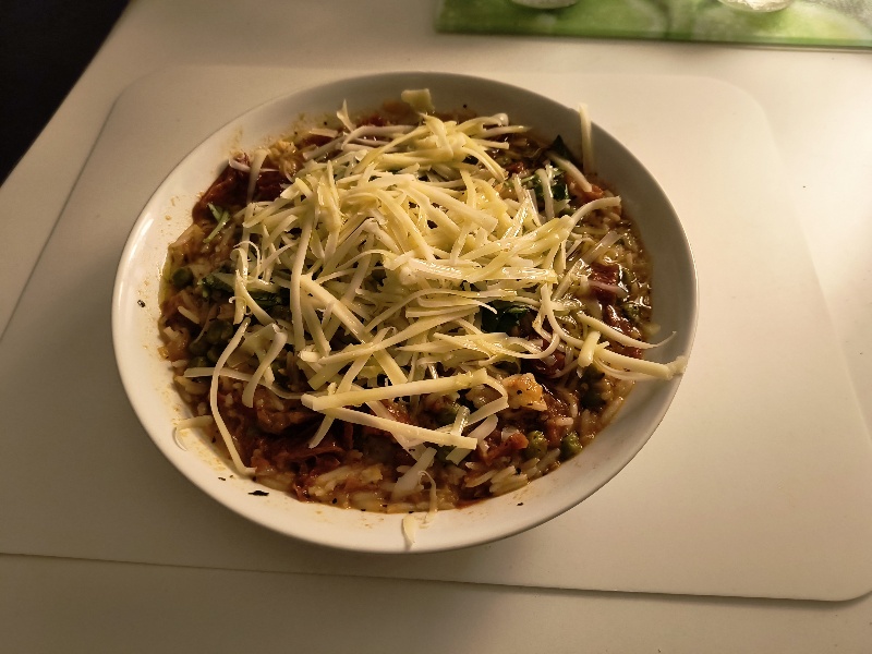 Teszínes, paradicsomos rizottó, aszalt paradicsommal, zöldborsóval.